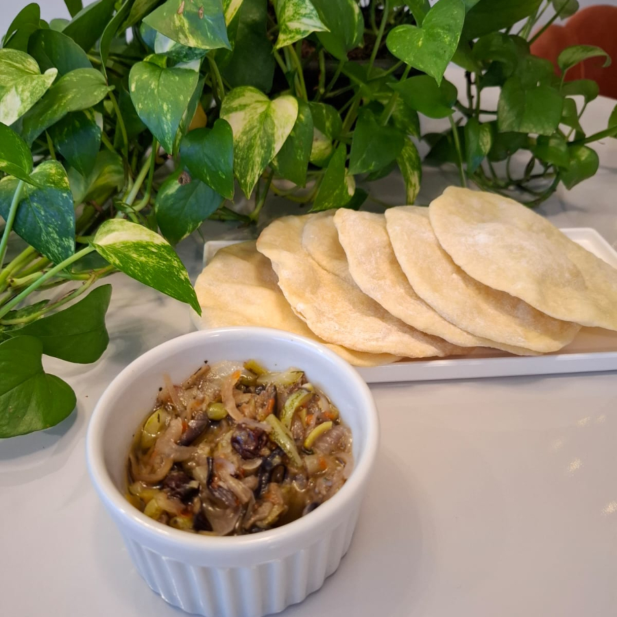200g de caponata de beringela, um mix de vegetais embebidos no azeite de oliva com azeitonas e passas. Acompanha 5 pães sírios. Não contém glúten, exceto pão sírio. Produto Vegano!