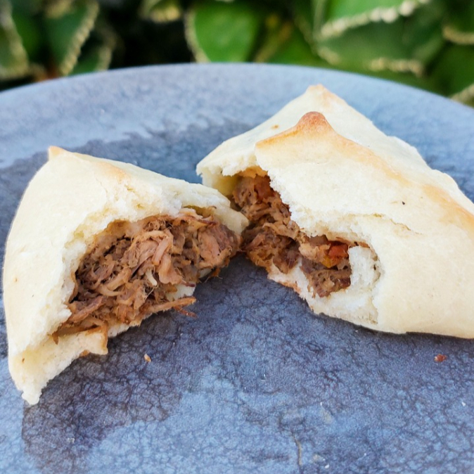 Esfiha Fechada de Costela, autêntica, feita a moda árabe, massa de pão sírio com um delicioso recheio de costela bovina desfiada. De tamanho media, cerca de 60g.