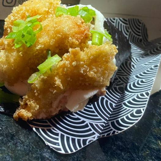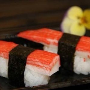 2 unidades com kani com arroz. Já acompanha par do hashi, molho teriyaki, molho shoyu e nozuk (molheira)