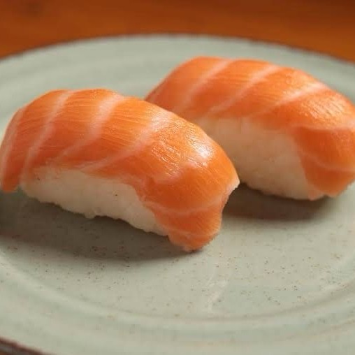 2 unidades de salmão fresco com arroz. Já acompanha par do hashi, molho teriyaki, molho shoyu e nozuk (molheira)