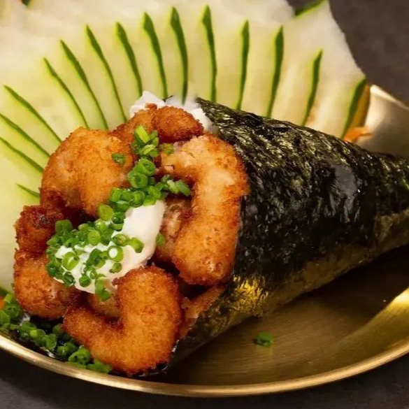 Temaki feito na alga com arroz e recheio de Salmão grelhado com camarão empando crocante