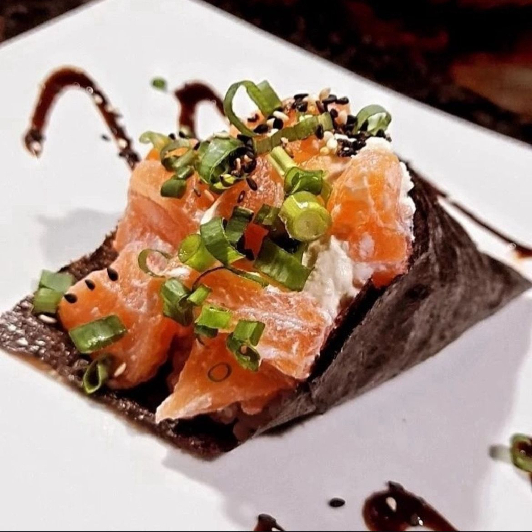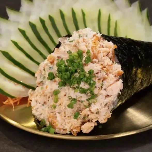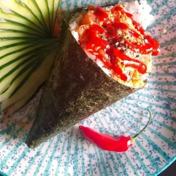 Enrolado na alga com formato de cone, recheado com salmão fresco arroz japonês Já acompanha 1 hashi, 1 molho teriyaki, 1 molho shoyu.