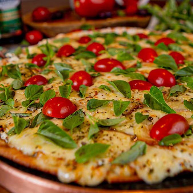 Deliciosa pizza artesanal de tamanho grande, perfeitamente dividida em oito fatias generosas. Preparada com uma massa fresca e crocante, coberta com um autêntico e suculento molho de tomates italianos. Abundantemente recheada, proporcionando uma experiência culinária realmente satisfatória. Oferecemos a você a oportunidade de personalizar sua pizza, escolhendo dois sabores irresistíveis. Uma autêntica experiência italiana em cada pedaço!