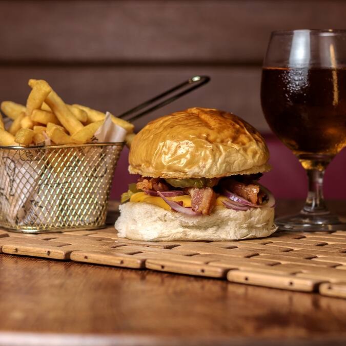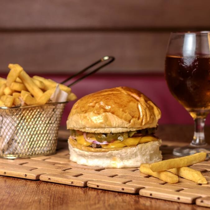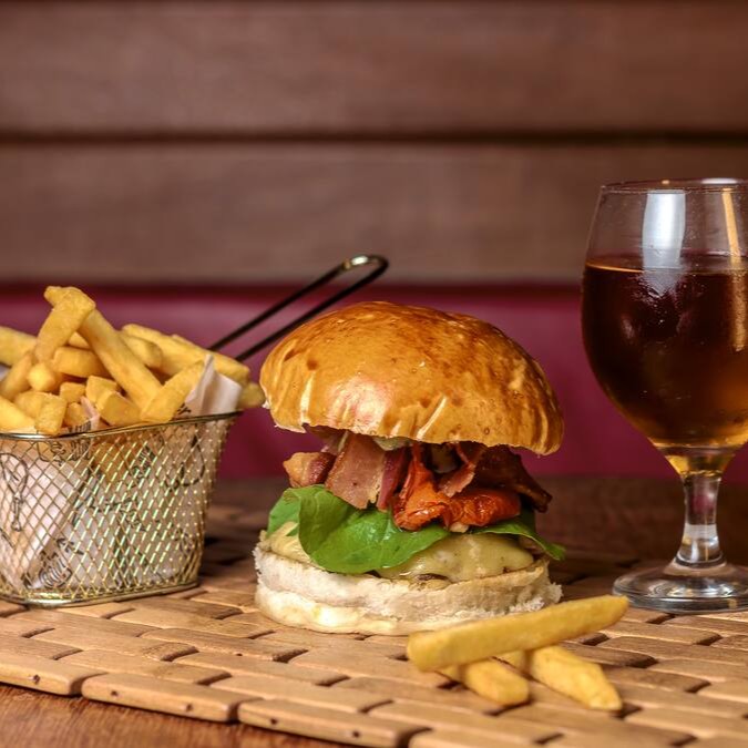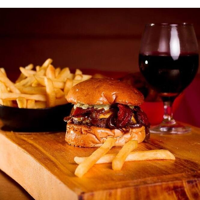 Burguer bovino de aproximadamente 150g, blend da casa, queijo cheddar, bacon, cebola caramelizada, molho de ervas no pão australiano ou brioche. + porção de batata frita + refri lata.