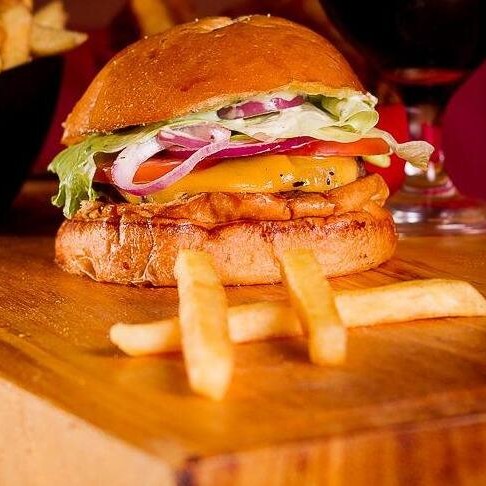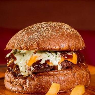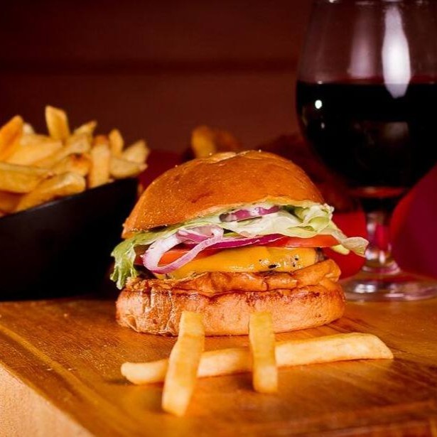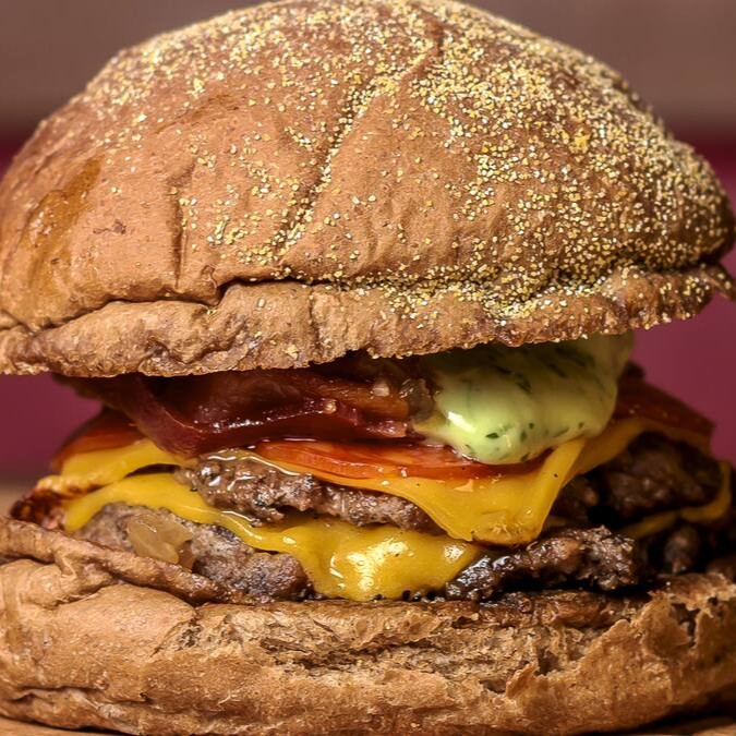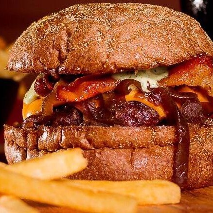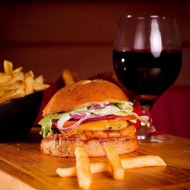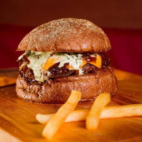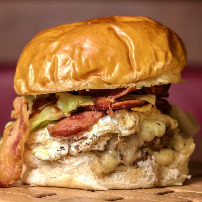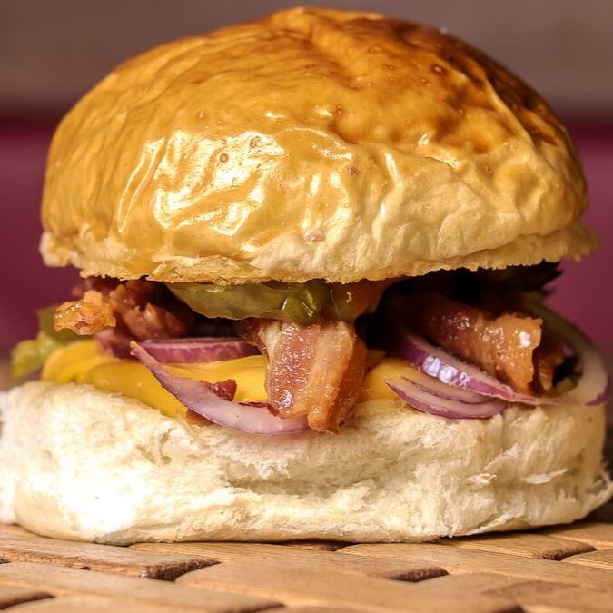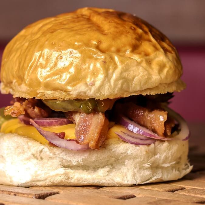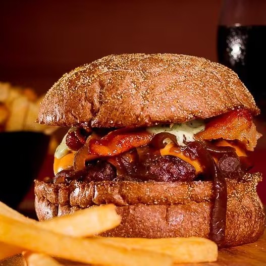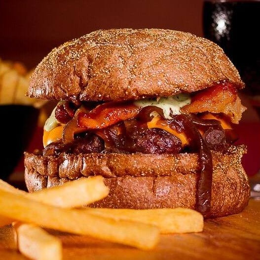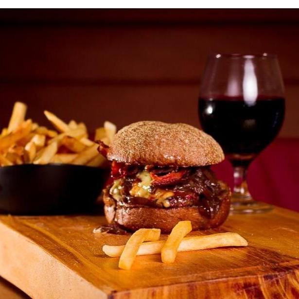Burguer bovino de aproximadamente 150g, blend da casa, queijo cheddar, bacon, cebola caramelizada, molho de ervas no pão australiano.
