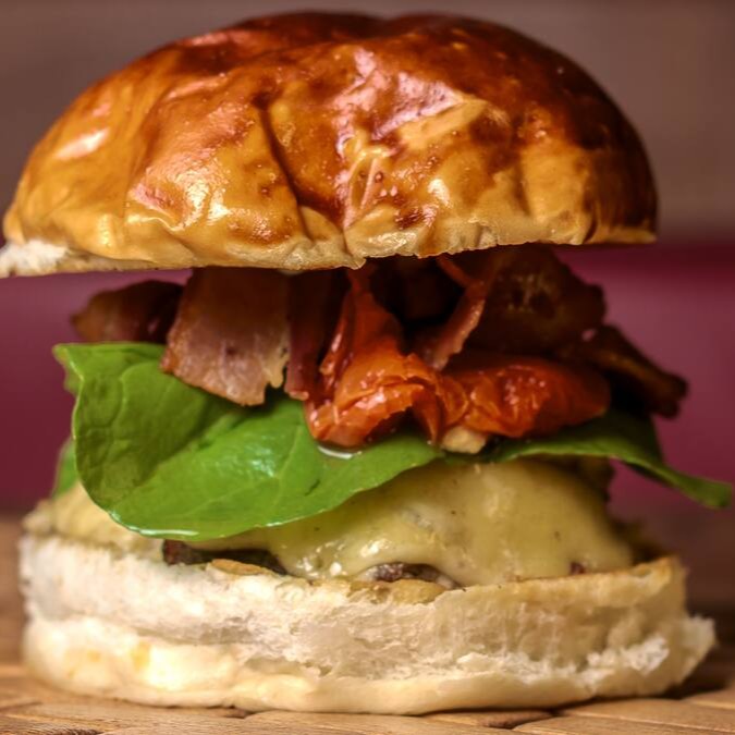 Burguer bovino de aproximadamente 150g, grelhado, provolone, tomate seco, rúcula, bacon, molho da casa no pão batata.