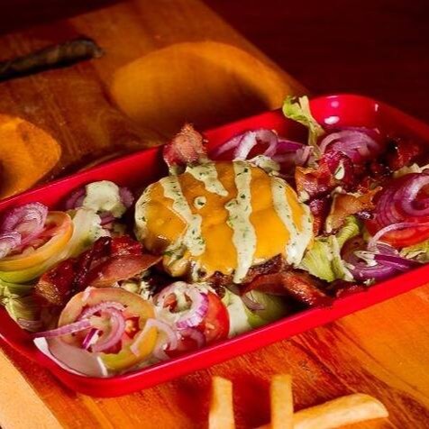 Burguer bovino de de aproximadamente 150g, queijo prato ou mussarela, bacon, alface americano, tomate, cebola roxa e molho de ervas.