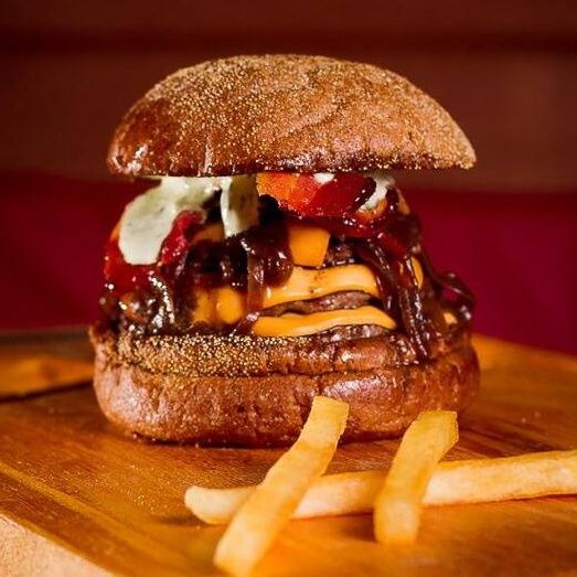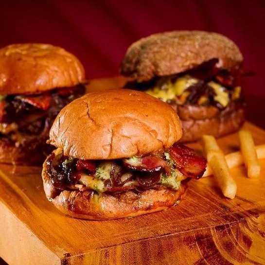 03 carnes de aproximadamente 75 (cada) blend da casa, queijo cheddar, cebola caramelizada, bacon, molho de ervas, no pão australiano.