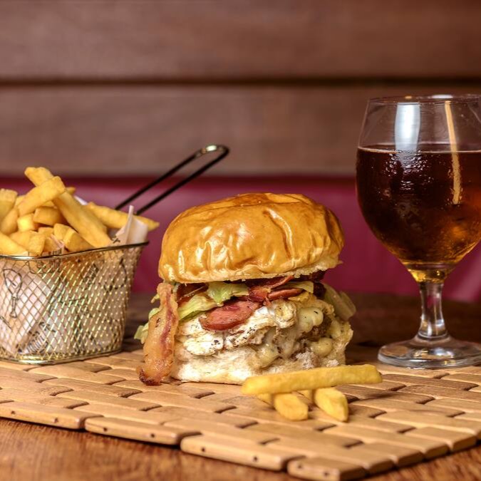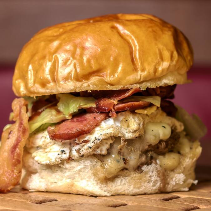 2 carnes bovina 75g, queijo bacon, ovo, calabresa, cebola roxa, alface americano, molho de ervas no pão de batata.