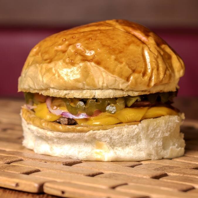 Burguer bovino de aproximadamente 75g, grelhado, queijo cheddar, cebola roxa, picles, molho especial, no pão batata.