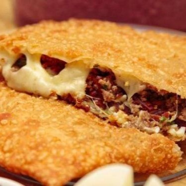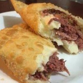 Pastel de carne bovina e queijo mussarela feito na hora.