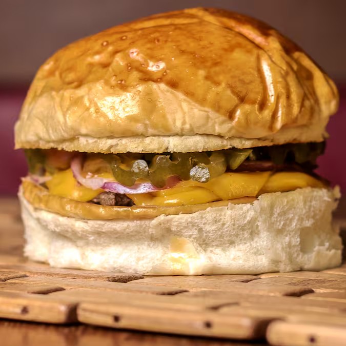 Burguer bovino de aproximadamente 150g, blend da casa, queijo cheddar, cebola caramelizada, molho da casa, no pão australiano.