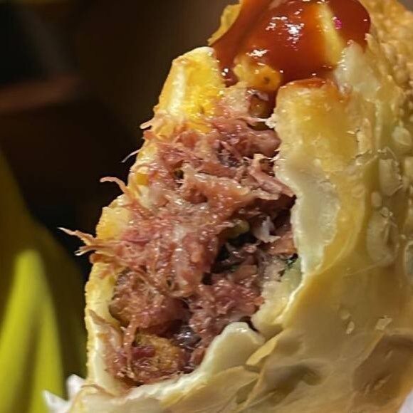 Pastel composto por carne seca, calabresa, banana da terra frita, bacon e queijo mussarela.