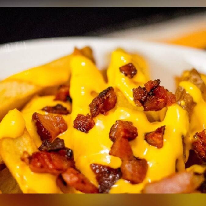Porção de batata com cheddar e bacon em cubo. Lembrando que batata é um item muito sensível, e em grandes distâncias pode perder um pouco a qualidade.
