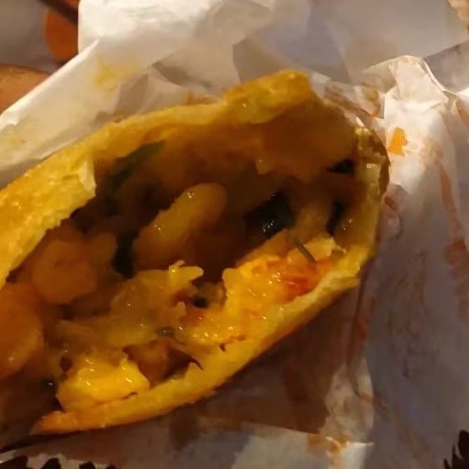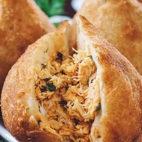 Bolinho salgado, com recheio de carne, uva passas e pimenta (indicado para quem gosta de pimenta). 20g cada.