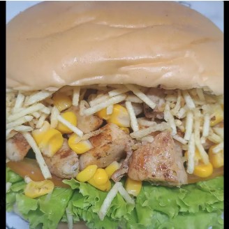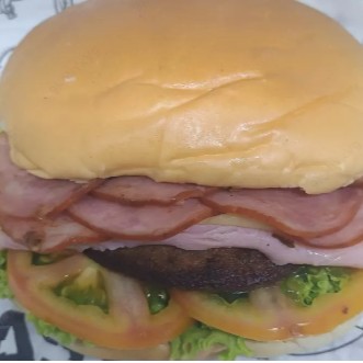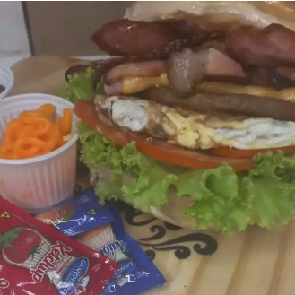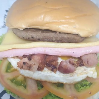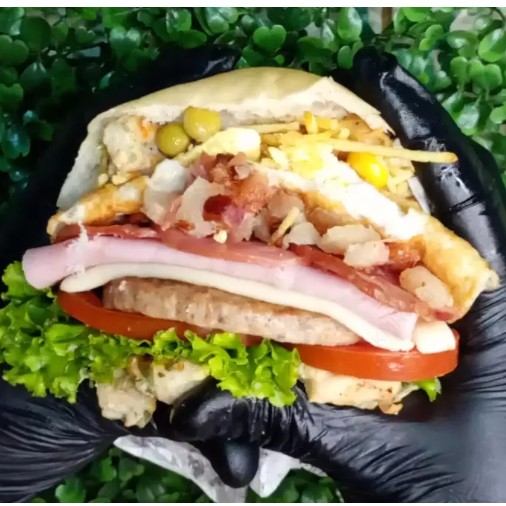 carne, queijo, presunto, ovo , bacon, calabresa, milho, ervilha , batata palha , salada