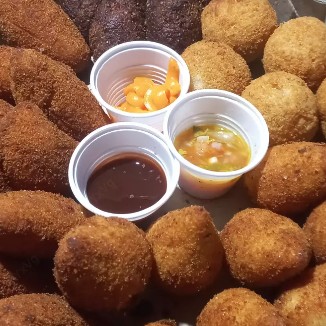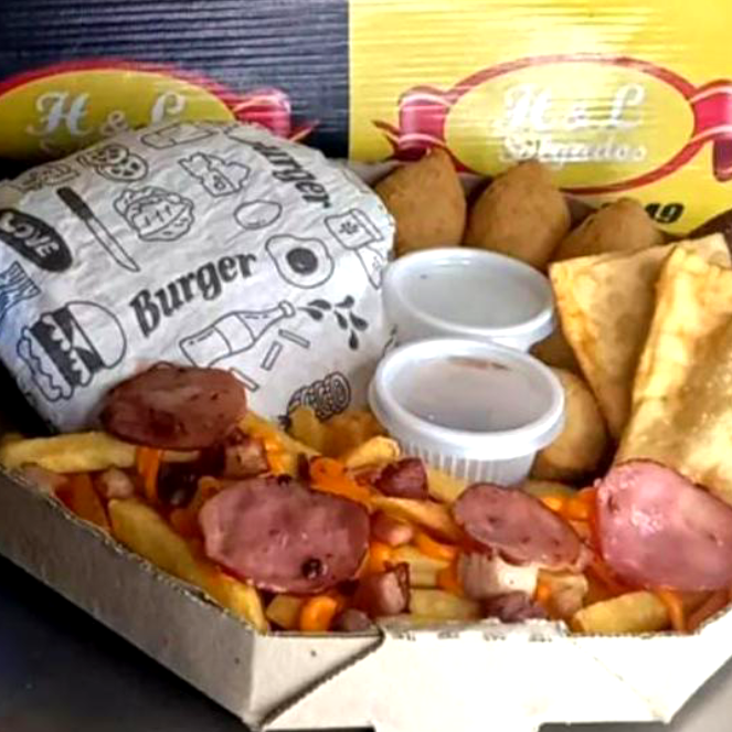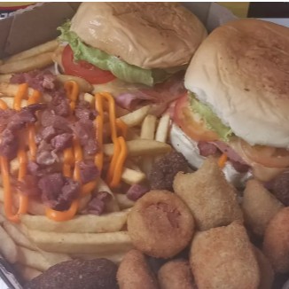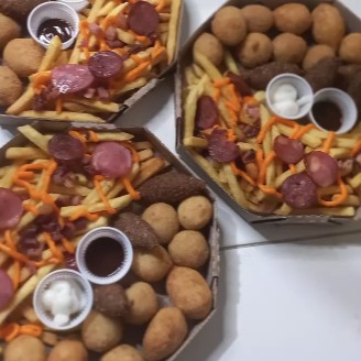 1 x bacon;1 x calabresa;1 x frango, 15 salgados sortidos, batata G