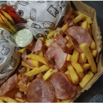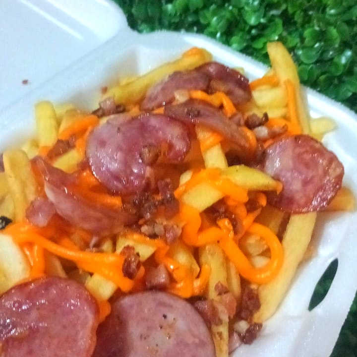 aprox 500g de batata com bastante molho cheddar , calabresa e bacon