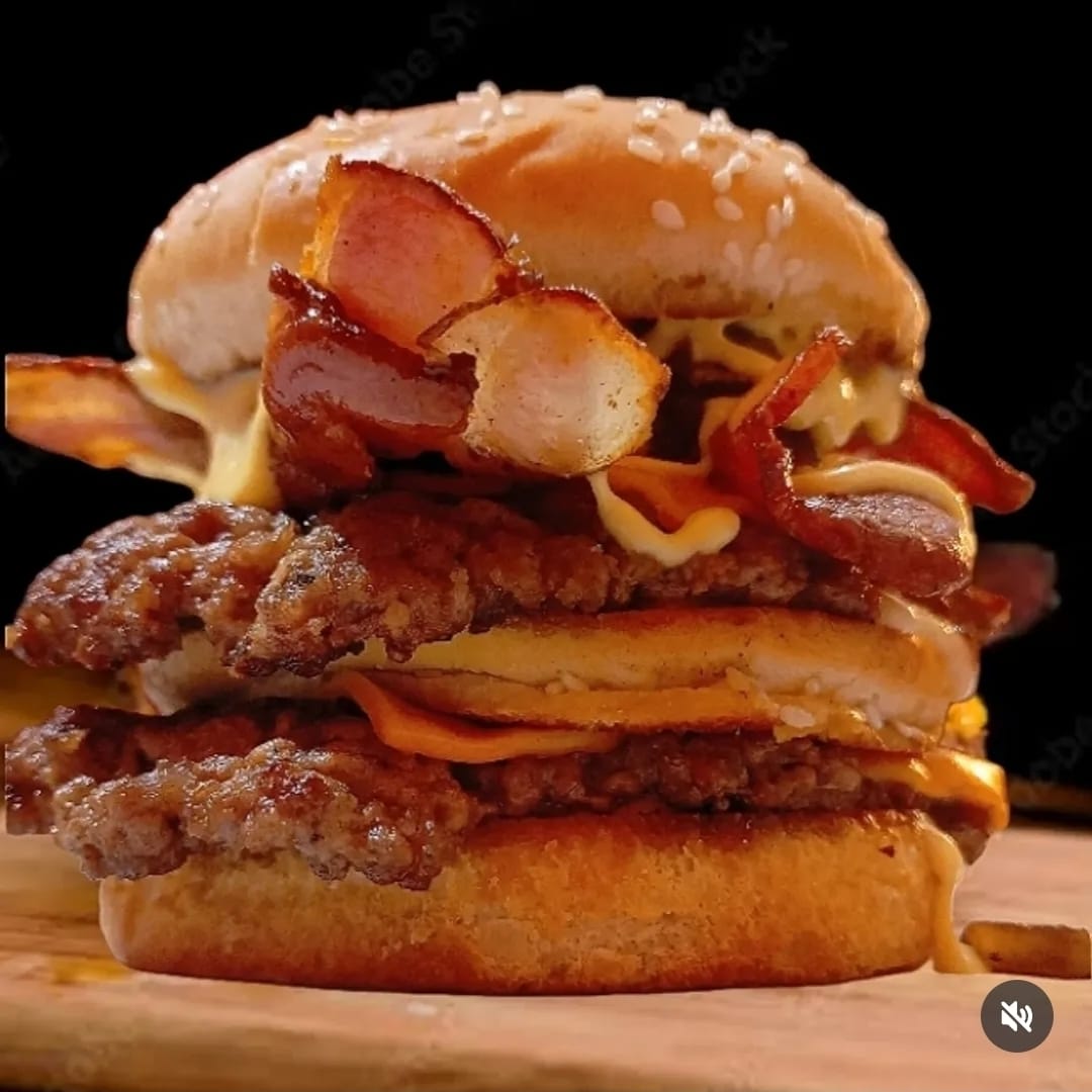 Dois smashs de carne bovina, dois queijos chedder, cebola caramelizada, Bacon, molho mostarda e mel, molho