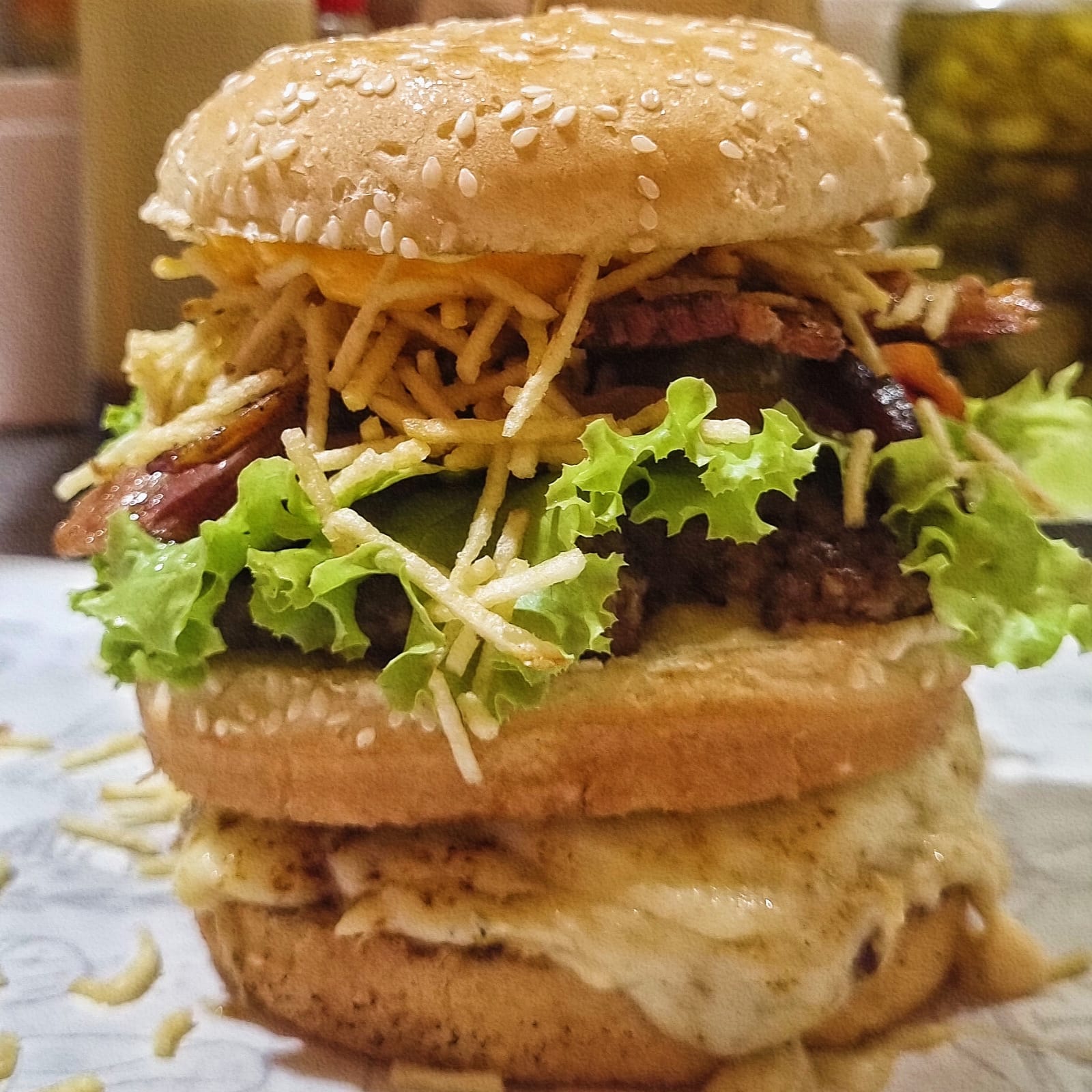 2 blends de carne 120g cada, queijo coalho maçaricado, bacon, salada de alface, tomate e picles, molho cheddar, molho da casa, batata palha.