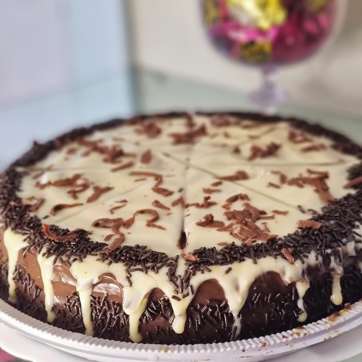 fatia de torta dois amores, recheio de ninho com brigadeiro