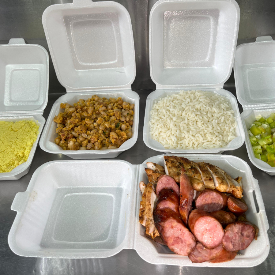 H2 de feijão tropeiro, H2 arroz, H1 farofa, H1 salada, 2uni toscana, 200g Bovina, 200g frango (filé), um refri 1l.