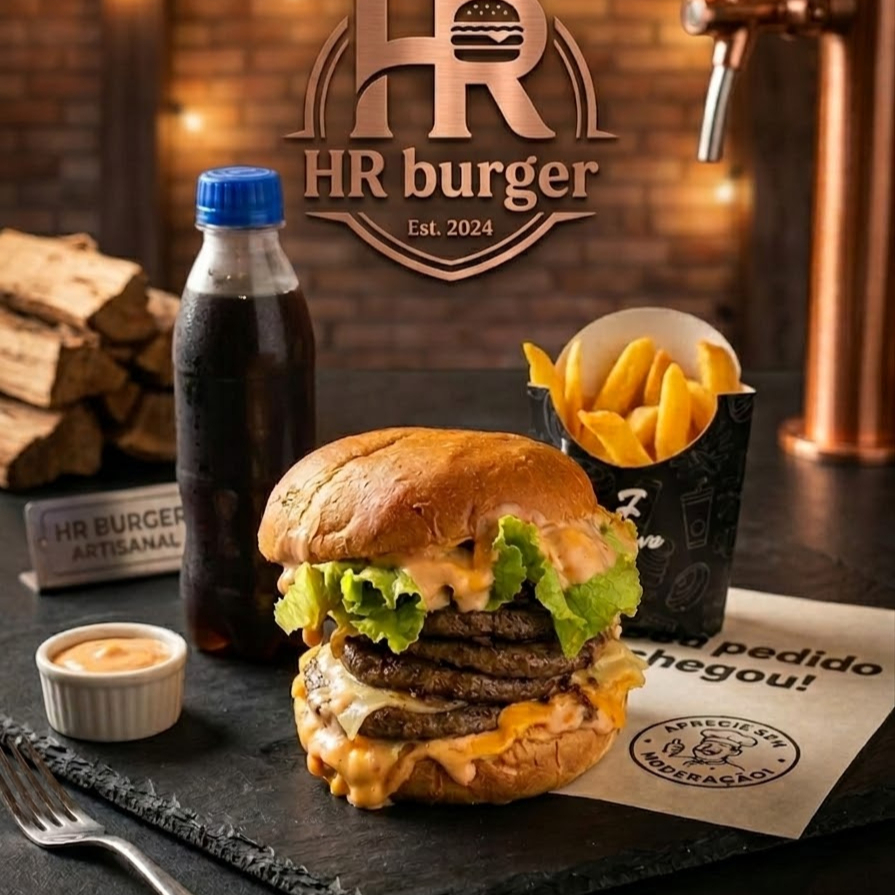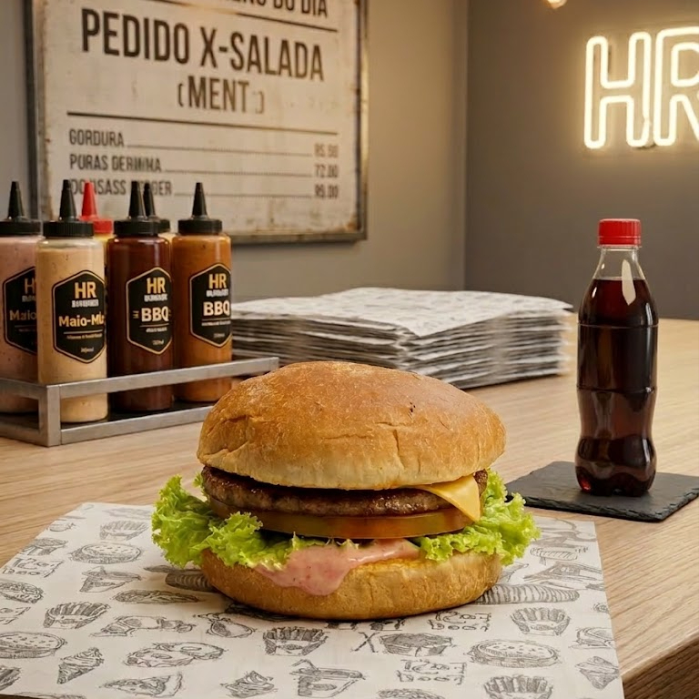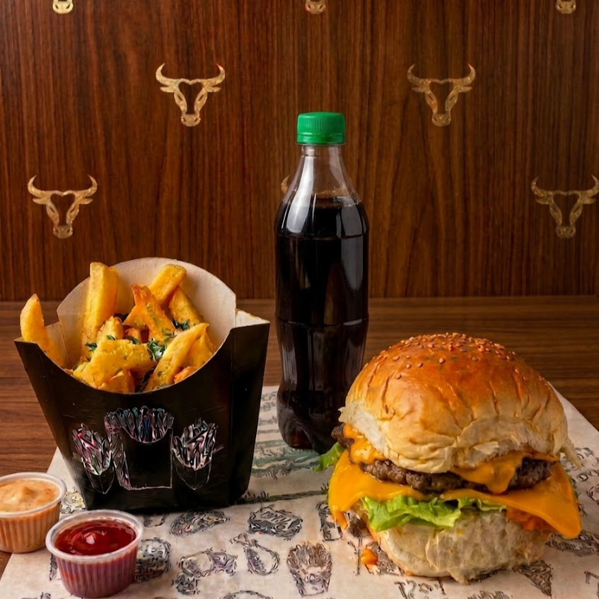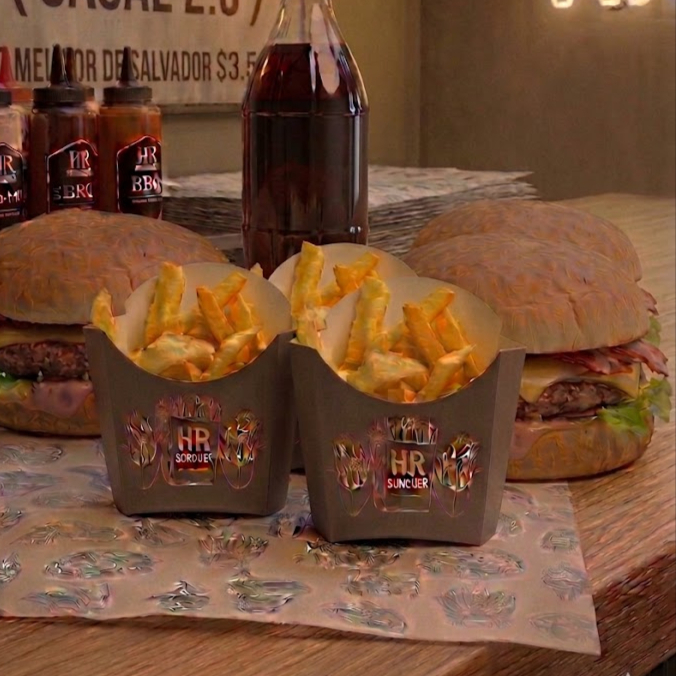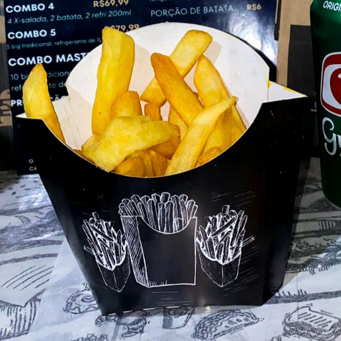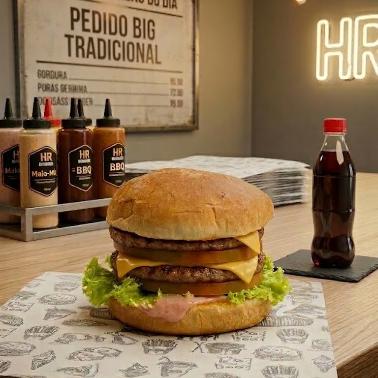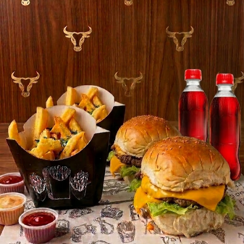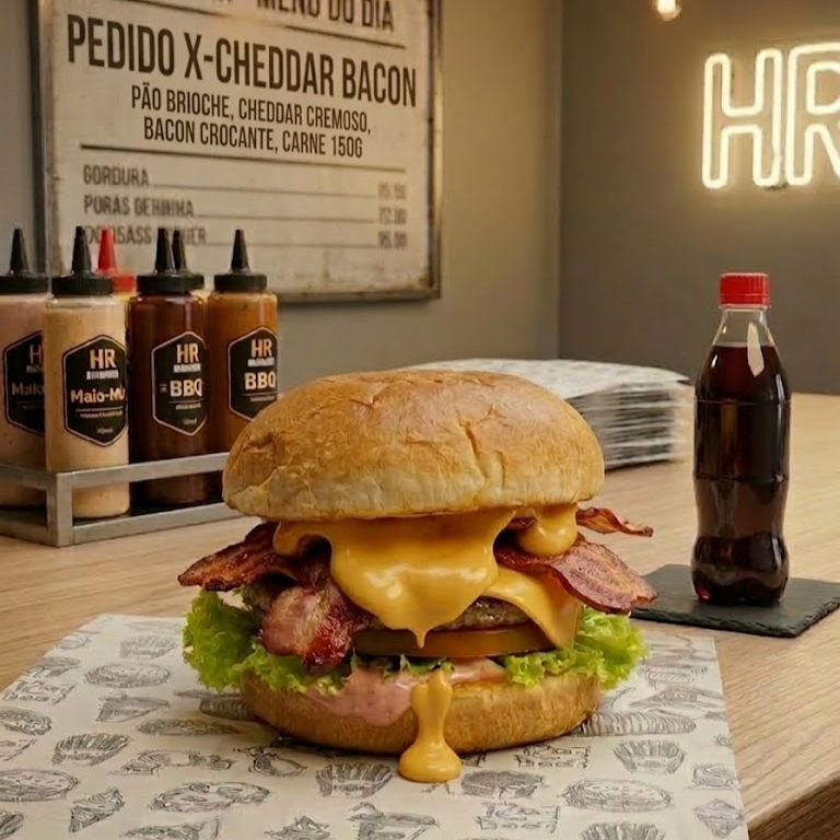 Pão, duas carne bovina, queijo, alface, molho cheda, bacon, batata frita, e refrigerante de 200ml