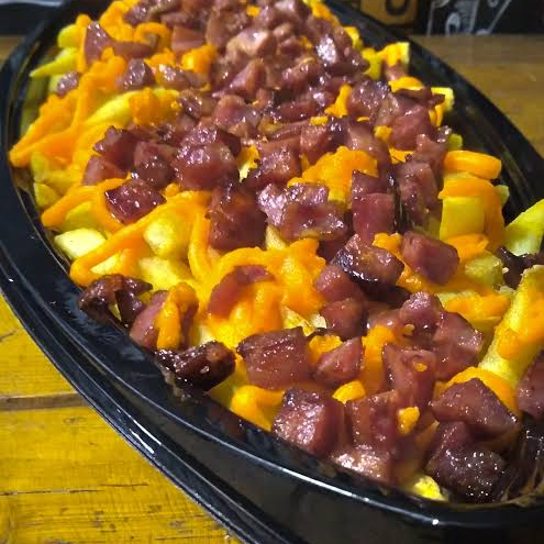 batata frita, cheddar em cima e bacon e calabresa fatiado + refri 200ml GRATIS