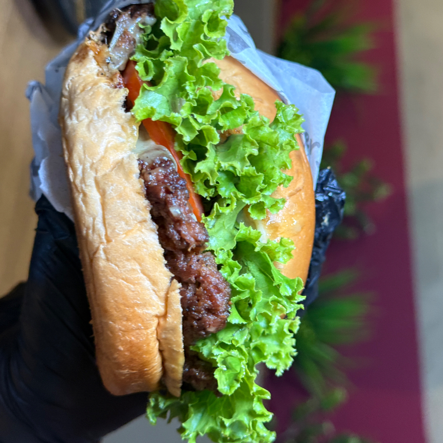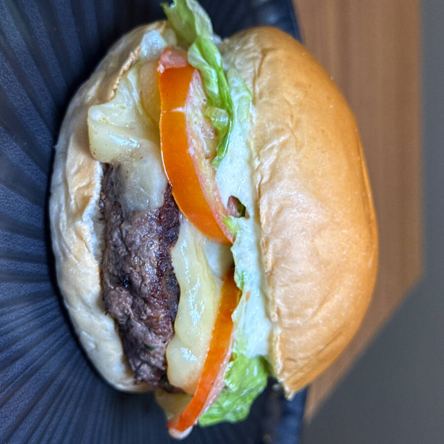 Pão brioche, smash 80g, queijo mussarela, alface, tomate e maionese verde.