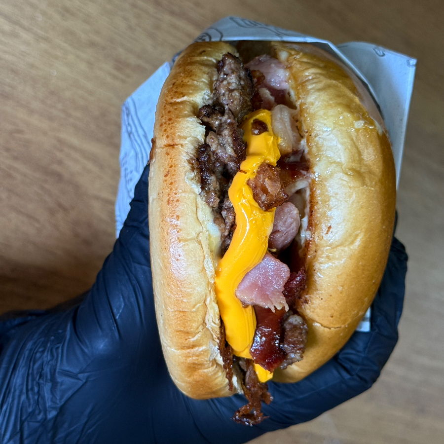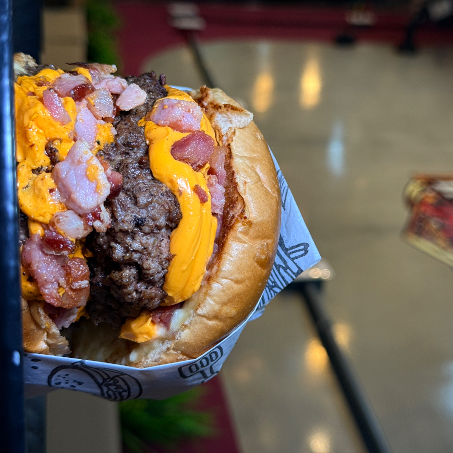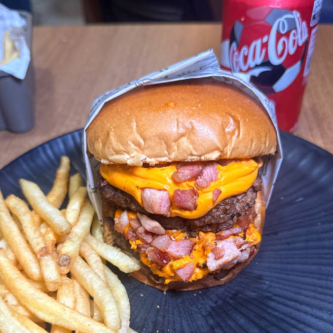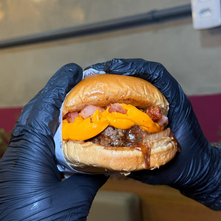 Pão brioche, smash 80g, queijo cheddar e bacon crocante.