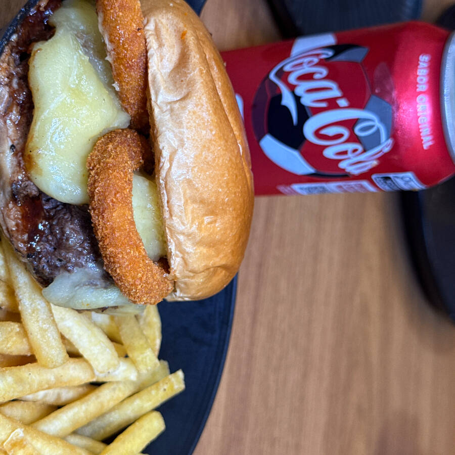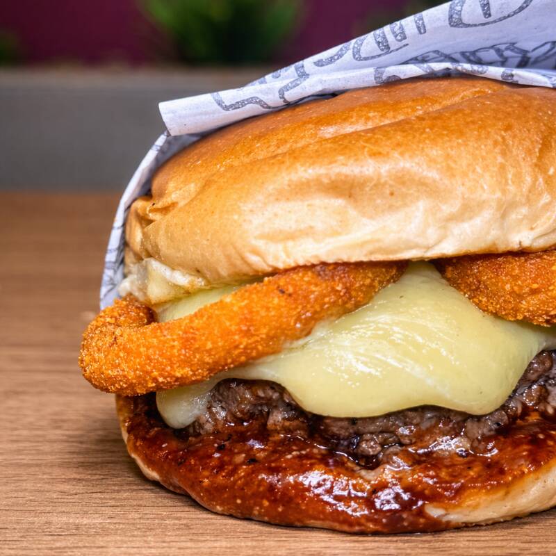 Pão brioche, Blend 150g, queijo mussarela, onion rings e molho barbecue.