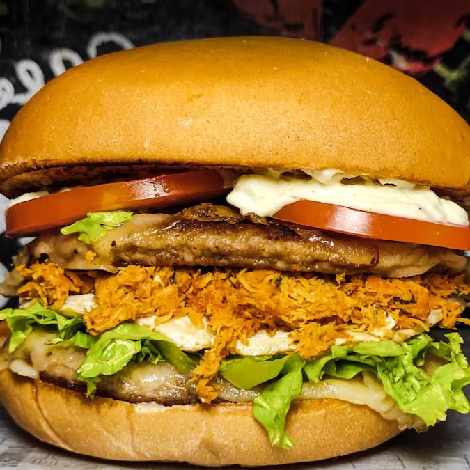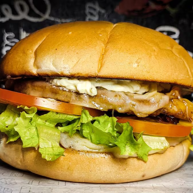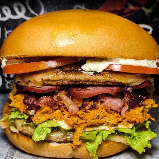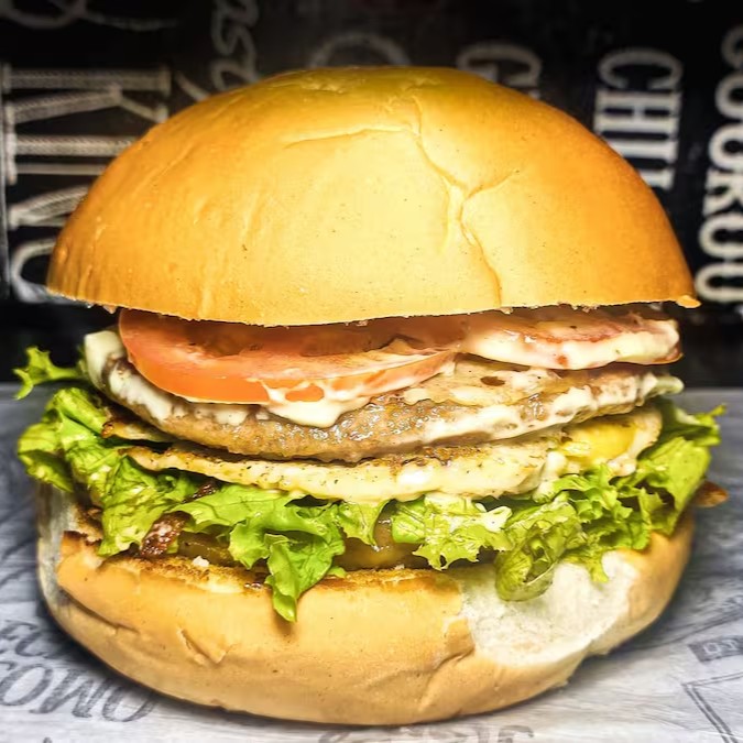 2 molhos, alface americano, tomate, duas carnes, duas fatias de muçarela, ovo e frango temperado.