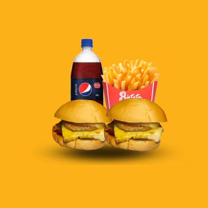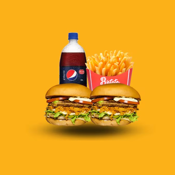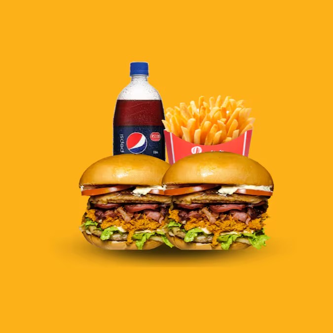 Acompanha dois hambúrgueres "Sem Miséria", um refrigerante 1l e uma batata frita simples.