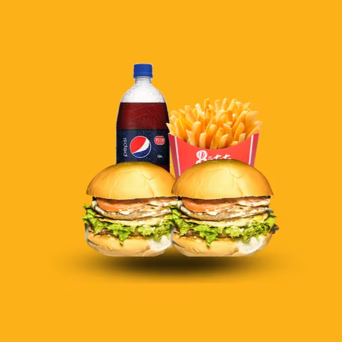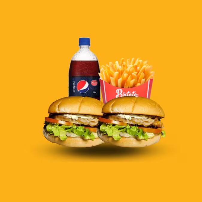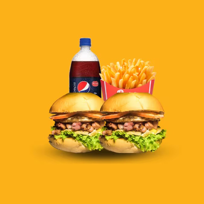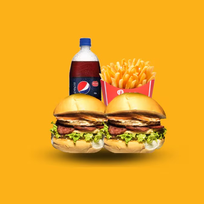 Acompanha dois hambúrgueres "Pega a Visão", um refrigerante 1l e uma batata frita simples.