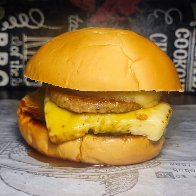 Barbecue, duas carnes, duas fatias de queijo, queijo coalho maçaricado com orégano e melaço.