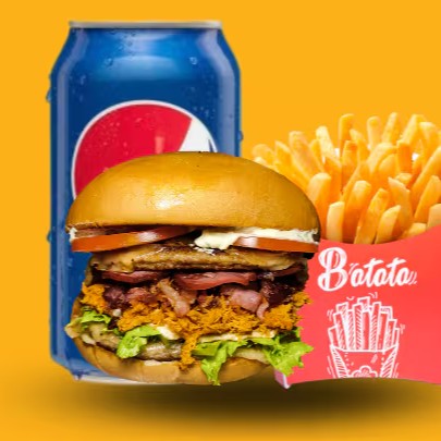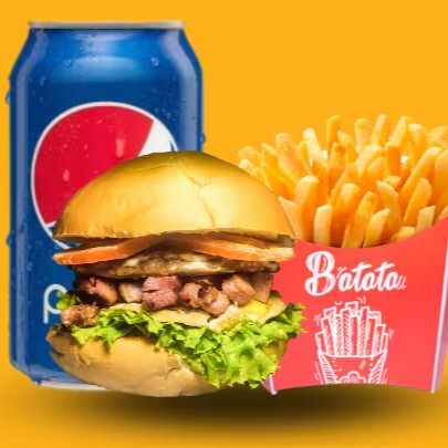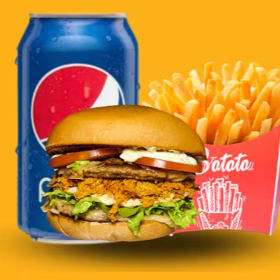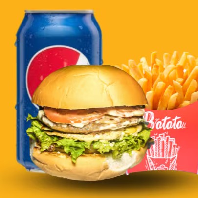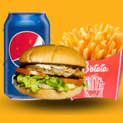 Acompanha dois hambúrgueres "Baratino", um refrigerante 1l e uma batata frita simples.