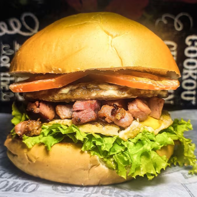 2 molhos, alface americano, tomate, duas carnes, duas fatias de muçarela, ovo e bacon.