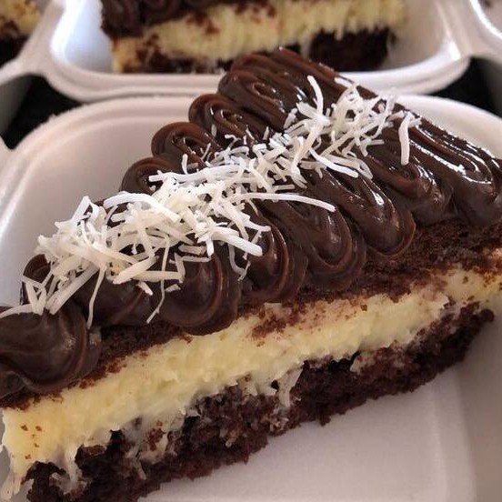 Torta com base chocolatuda, recheio cremoso de coco e cobertura de chocolate. Um clássico amado por todos.