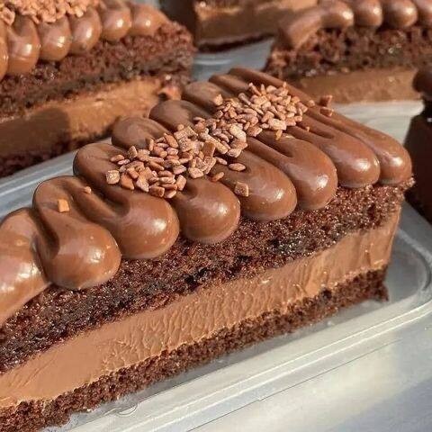 Fatia generosa de torta de chocolate cremosa, com sabor intenso e textura irresistível.