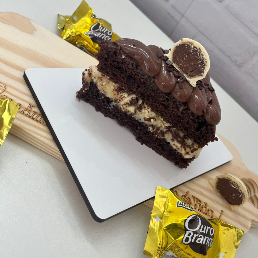 Massa de chocolate recheio de Ninho com pedaços de bombom Ouro Branco e cobertura de brigadeiro de chocolate .