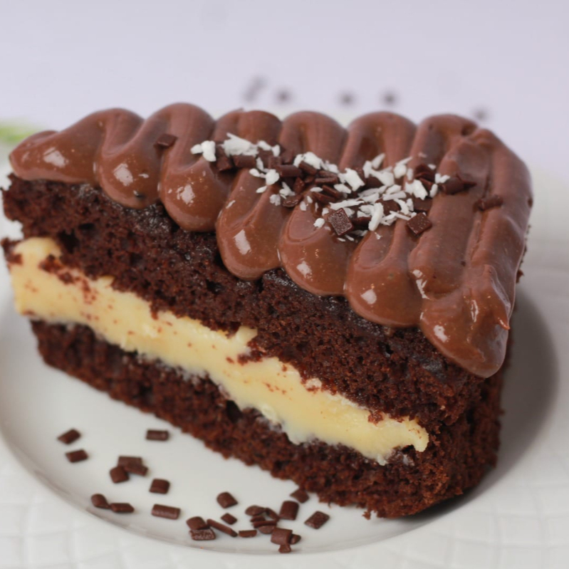Massa de chocolate recheio de coco com cobertura de chocolate.