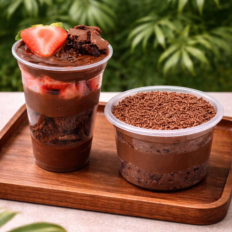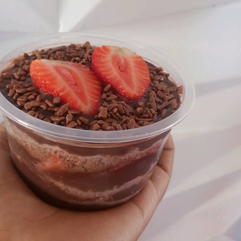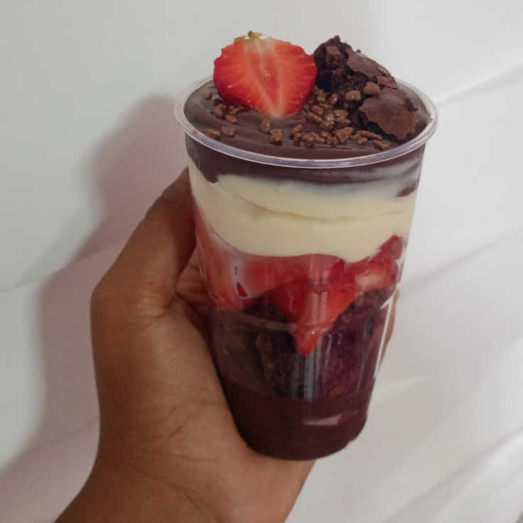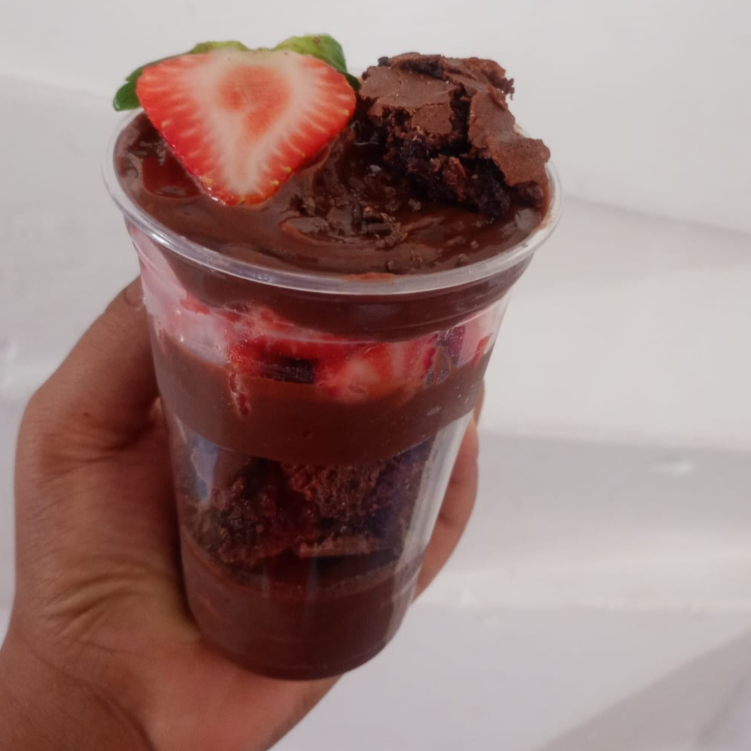 Para os apaixonados por chocolate, temos nosso copo de felicidade com o nosso chocolate bem cremoso brownie e morango, uma combina de se apaixonar