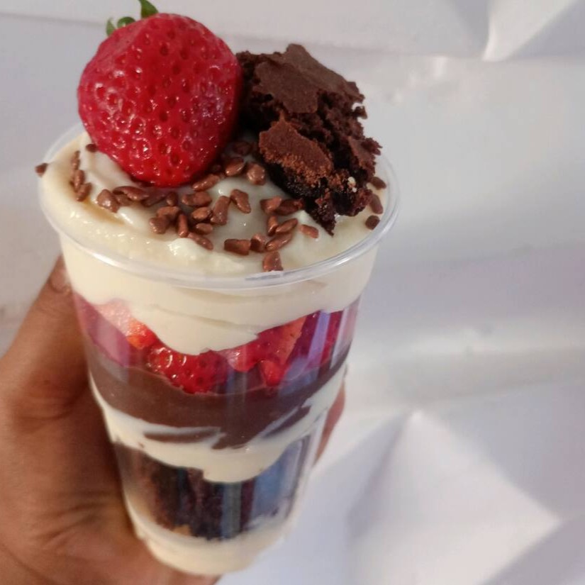 Nossos delicioso copo da felicidade uma grande tentação, recheio de Ninho, brownie, morango e chocolate cremoso 50%