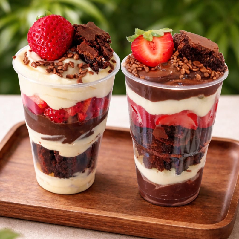 Dois copo da felicidade amor duplo e tentação com brownie e morango, ninho e chocolate 50% cacau super cremoso