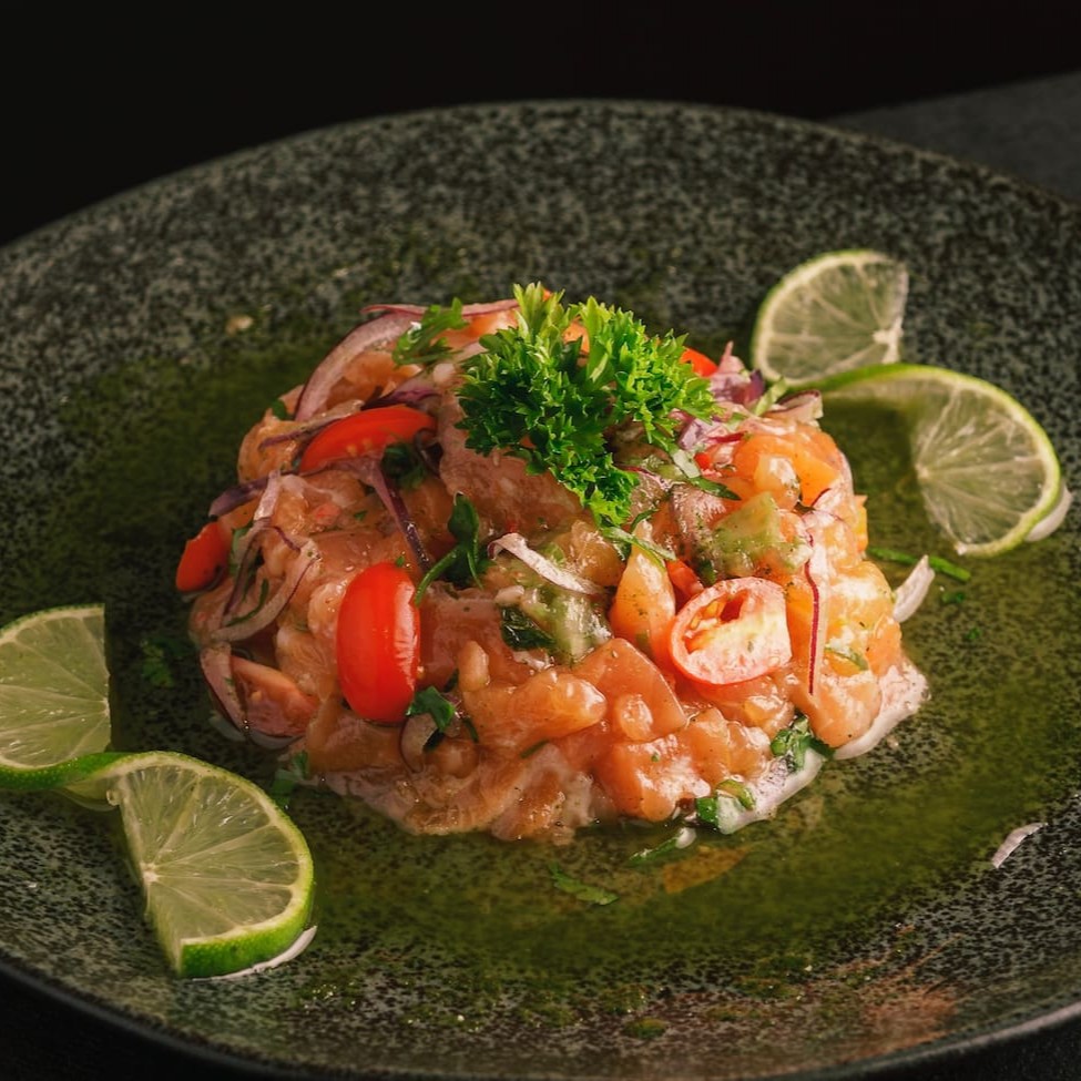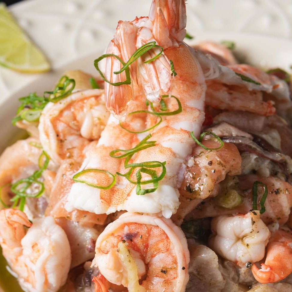 Cubos de salmão, peixe branco, camarão, polvo e kani marinados em molho à base de limão e laranja levemente apimentado. (300g)