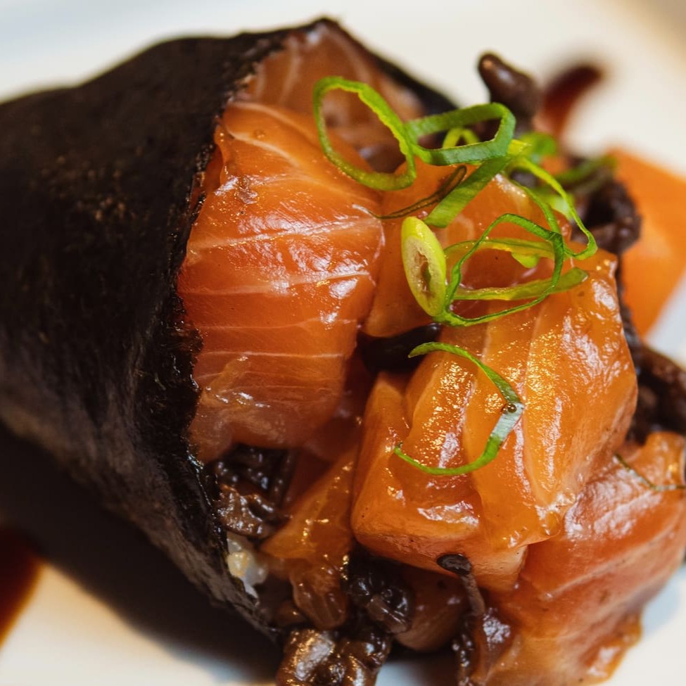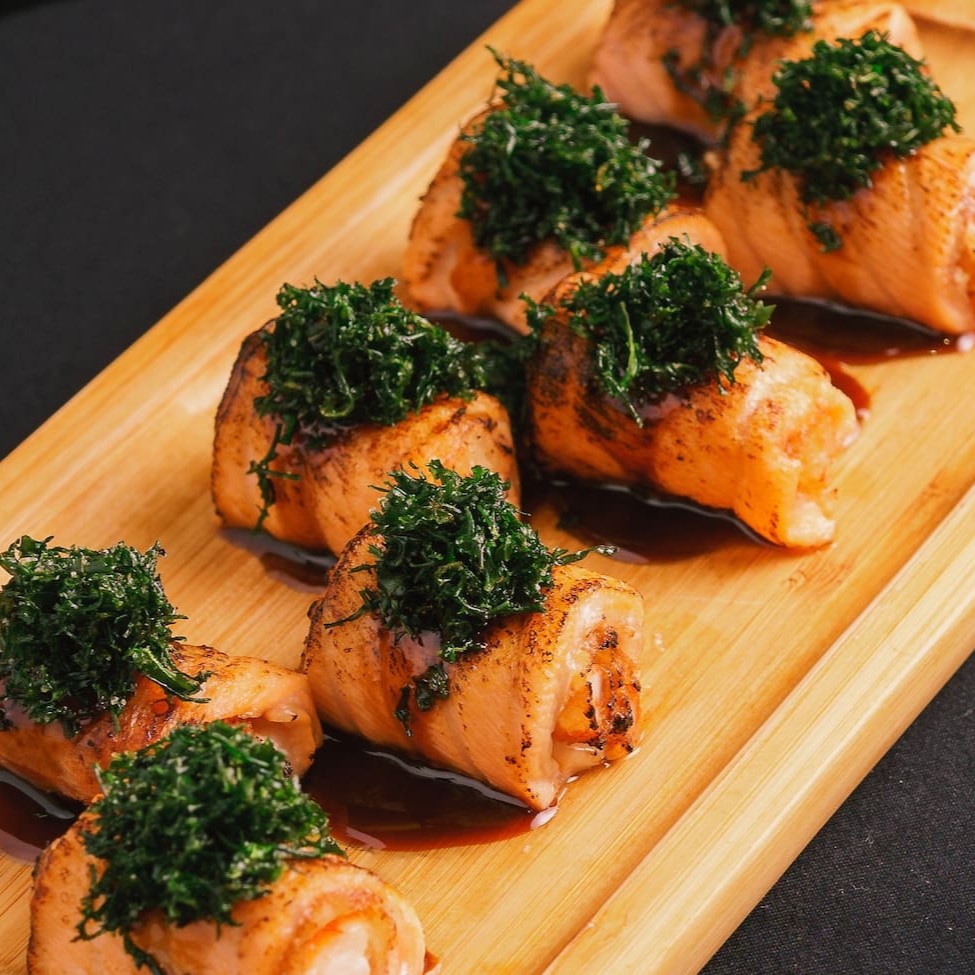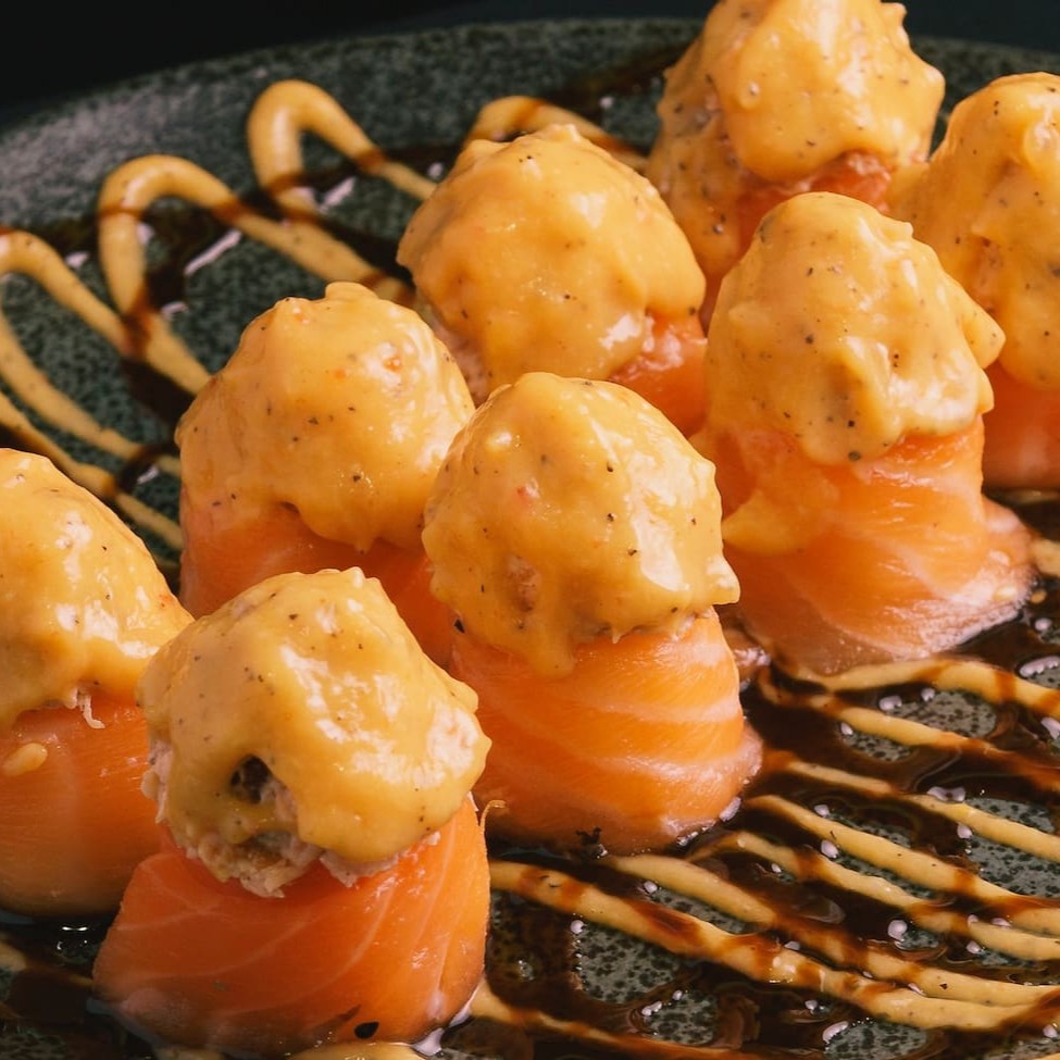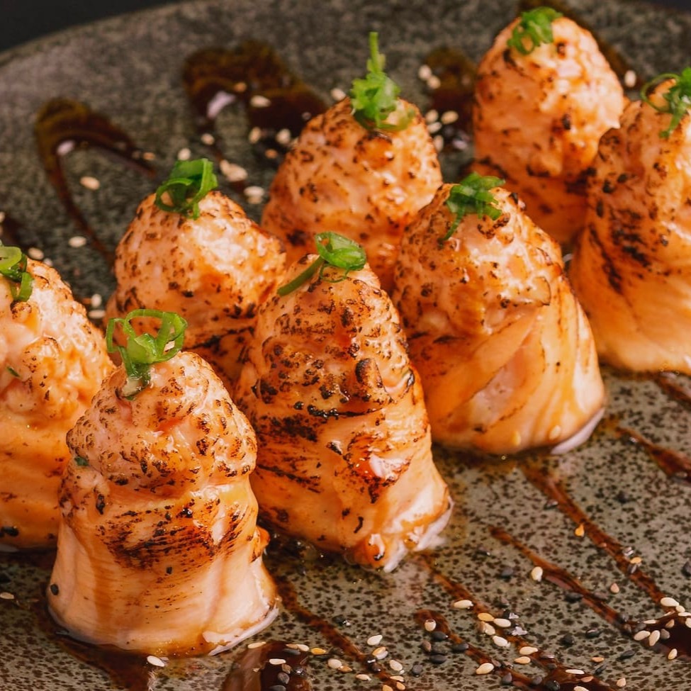 Arroz gohan envolto na lâmina de salmão maçaricado, coberto com cream cheese, tataki de salmão maçaricado e molho teriyaki.