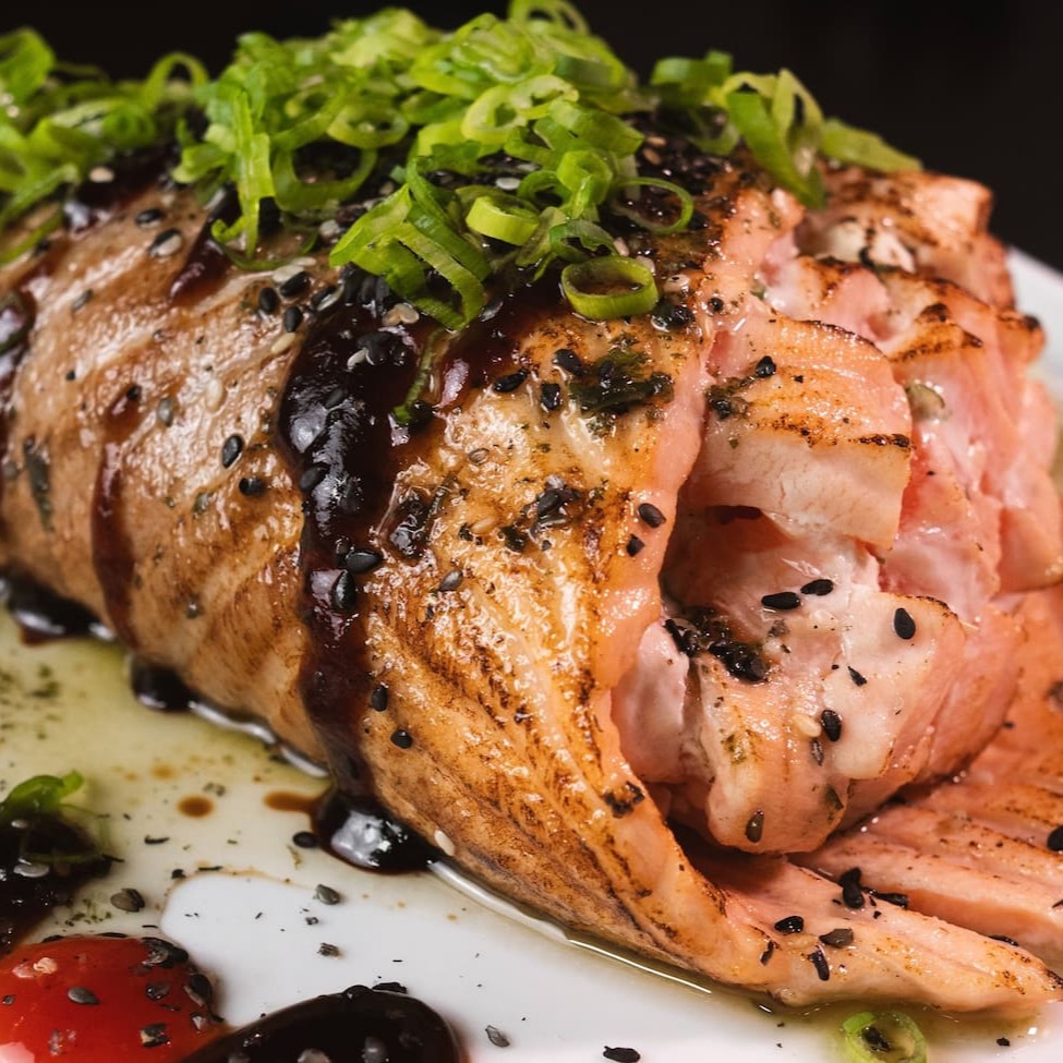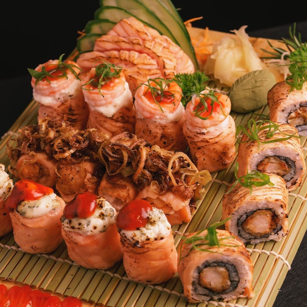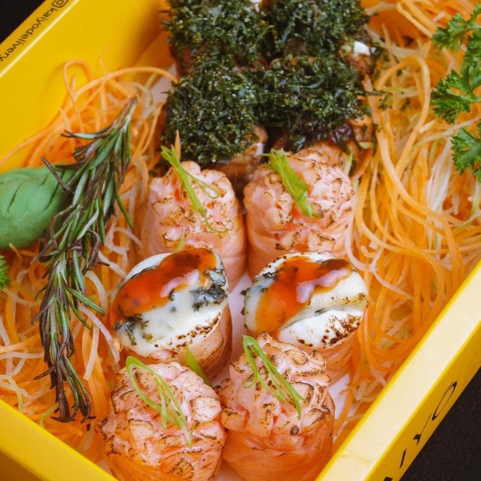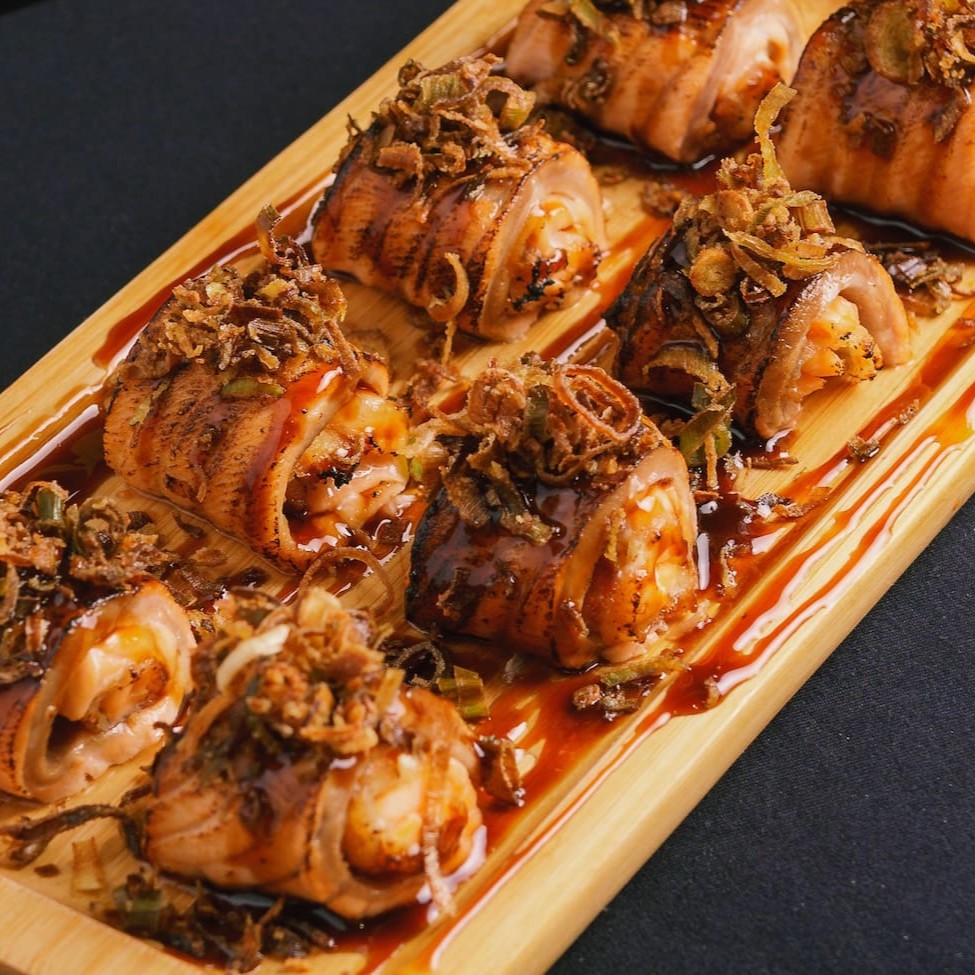 Arroz gohan envolto na lâmina de salmão maçaricado, coberto com cream cheese, tataki de salmão maçaricado e molho teriyaki.
