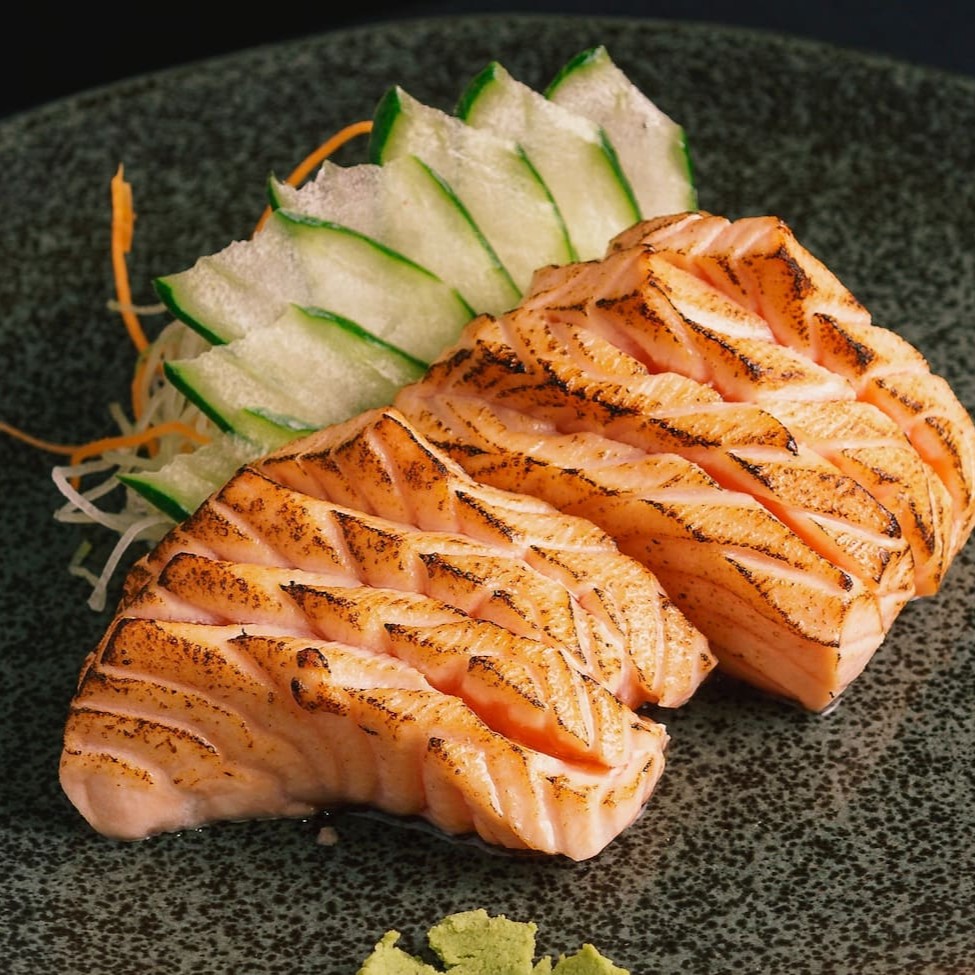 Lâminas de salmão maçaricado. (Acompanha: hashi, shoyu e teriaki)