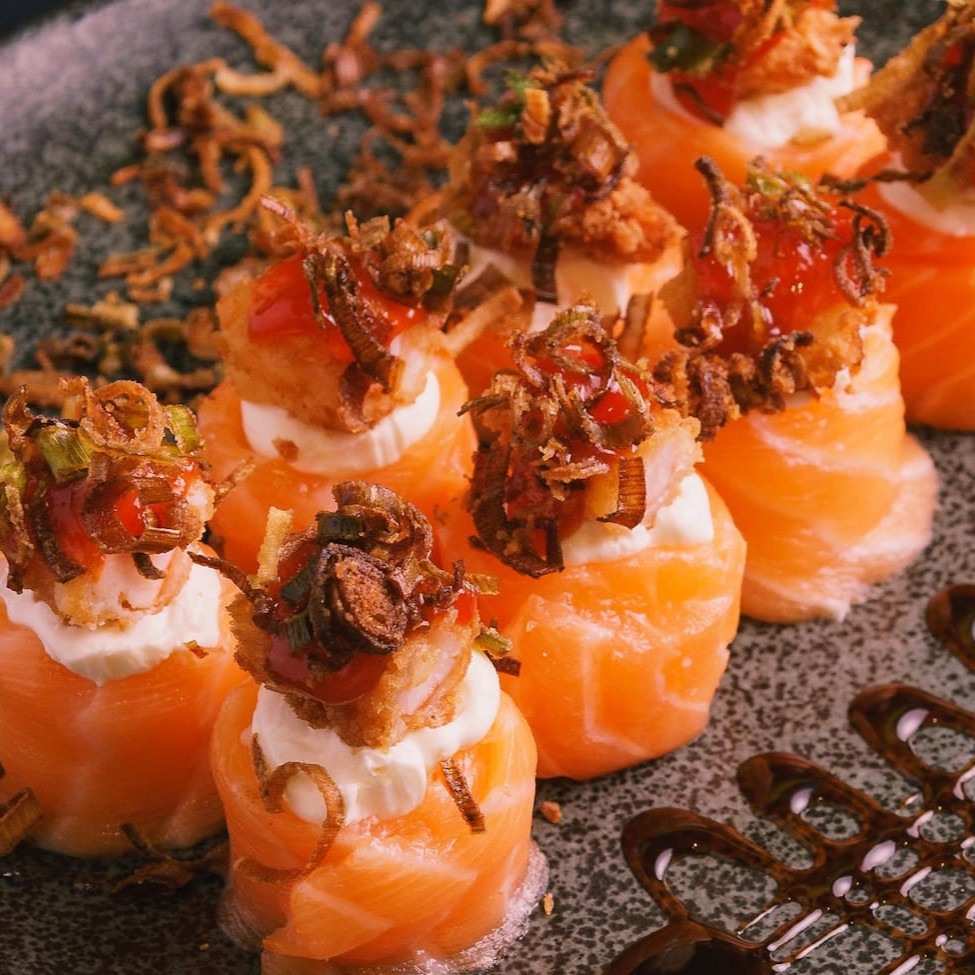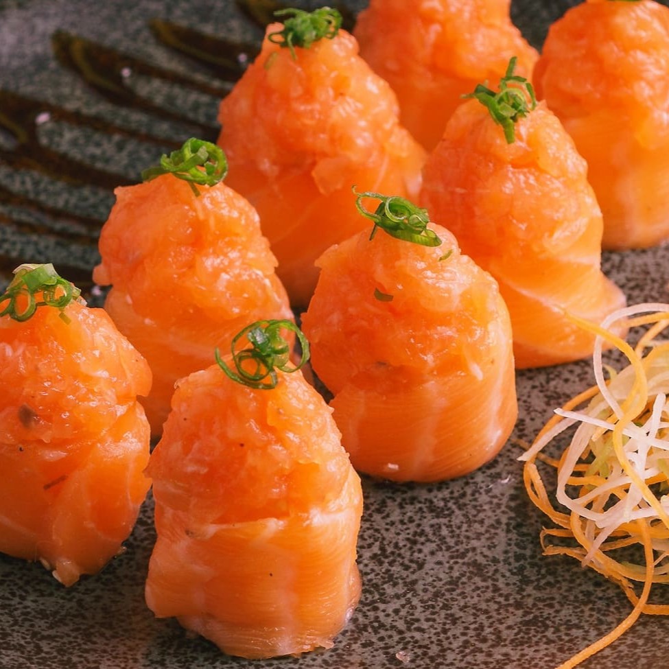 Arroz gohan envolto na lâmina de salmão, coberto com cream cheese, tataki de salmão fresco e cebolinha.