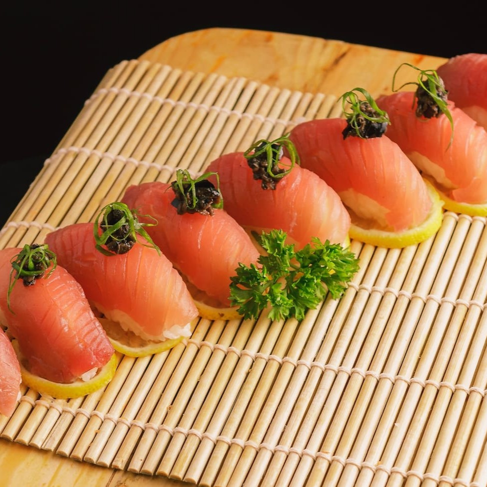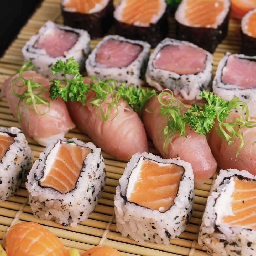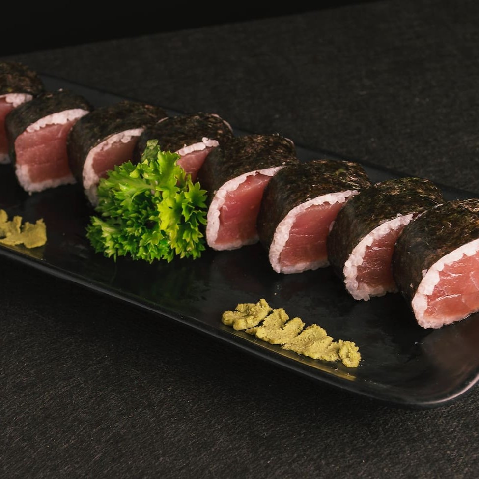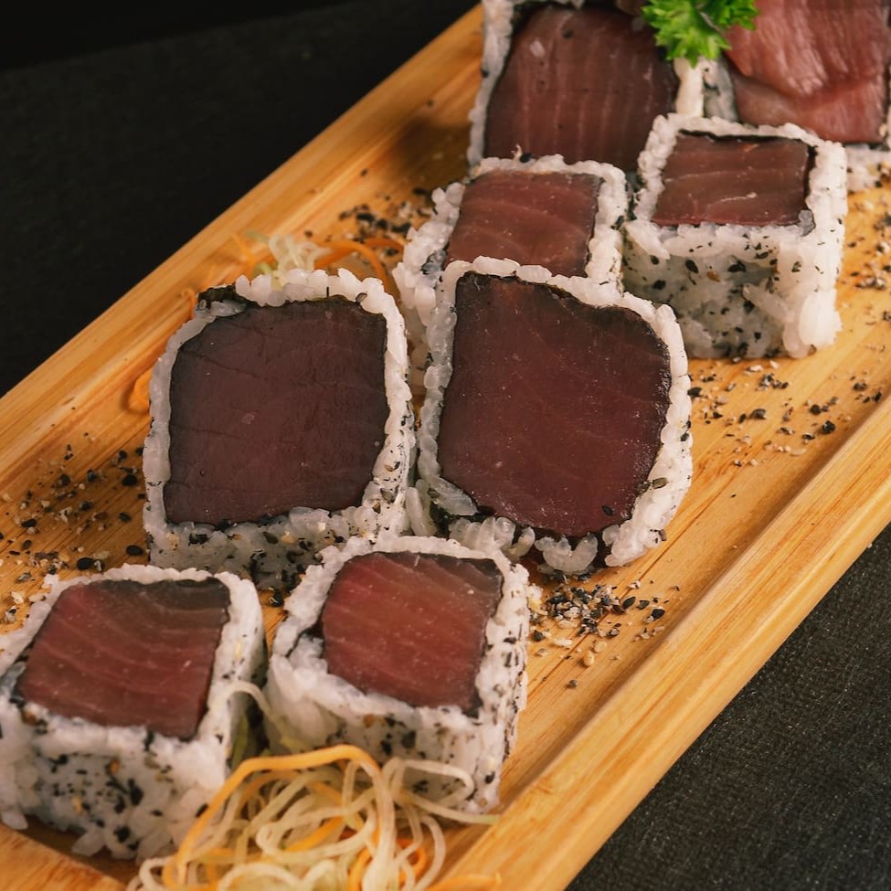 Atum com arroz gohan envoltos na alga nori. (Acompanha: hashi, shoyu e teriaki)